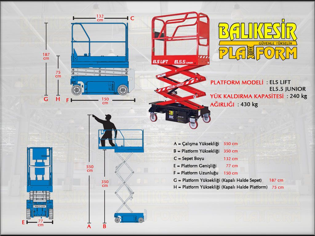 Gönen Platformdan kiralık "ELS LIFT EL5.5 JUNIOR" model 5.5 metre Akülü Makaslı Platform. Gönen, Balıkesir Platform Kiralama ve Satış